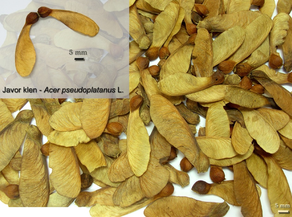 A. pseudoplatanus - klen - sklízíme rovněž v září. Plody opadávají v říjnu i později. Klíčivost bývá 80 - 90 %. Semena můžeme po přesušení ještě na podzim vysévat nebo suché osivo skladovat. Osivo 6 týdnů před výseven v březnu stratifikujeme. Za 2 - 4 týdny vzejde 400 - 500 semenáčků na 1 m2.